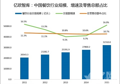 都说国人在嘴上从来不吃亏,据国家统计局的数据显示从2011年到2015年国内每年在吃喝上消费掉的金额占国内社会消费品零售总额均超过了10%,也就是说每花掉100元钱,十多块都是用在了下馆子或吃外卖上,并且每年国人在餐饮上的花费都有着明显的上涨,虽然2013和2014年可能由于经济环境及国家政策的原因导致了9.1%与9.7%的相对较低增长率,但2015年增长势头重新恢复,巨大的消费需求使得餐饮业消费金额相比去年增长了16.0%,国内吃货总计吃掉了3.2万亿的美食。