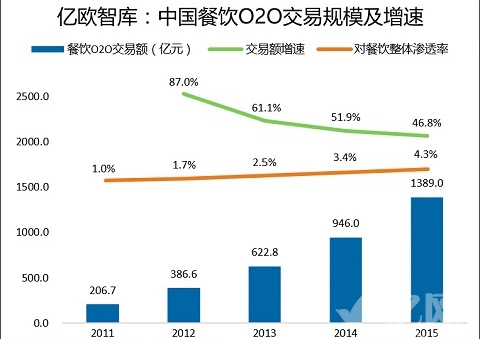市场的巨大让互联网公司也自然而然的加入到了这一行业,无论是餐饮信息、结账买单还是外卖、等位,每个细分领域都有着大量的玩家在相互角逐。从国家统计局及公开资料比对后可以看出,在激烈的竞争了多年后餐饮O2O行业增速开始逐步回落,但下滑的趋势逐渐变缓,也就是说未来餐饮O2O行业预计将依旧保持在20%到40%的区间内高速增长,虽然增速仅是最高点的不到一半,但参考亿欧读数之前的文章(智能手机仅增2%预示移动市场也要饱和了)可以看出,餐饮行业的发展算是足够健康的了。况且去年底餐饮O2O对于餐饮行业整体的渗透率仅仅达到了4.3%,餐饮的属性也许做不到电商等品类超过20%的渗透率但即使达到10%市场前景也依旧美好。