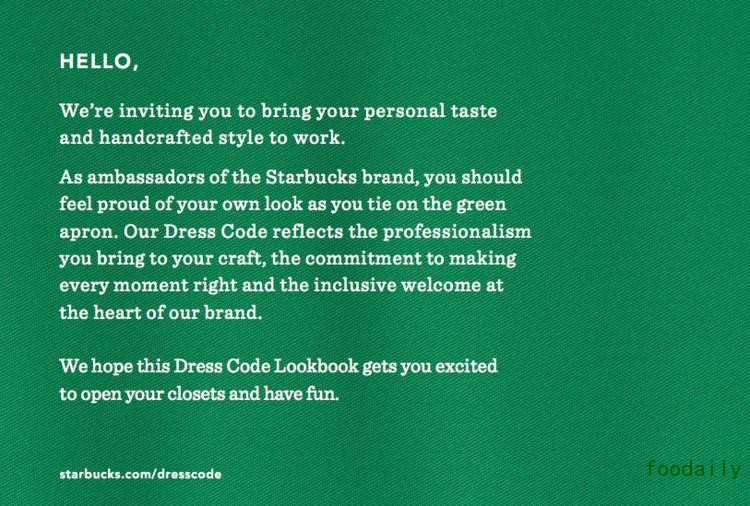 最近,星巴克在美国市场推出了最新一期的 LookBook,它在开篇处写道——我们(星巴克)邀请你将自己的品味和着装风格带到工作里来。