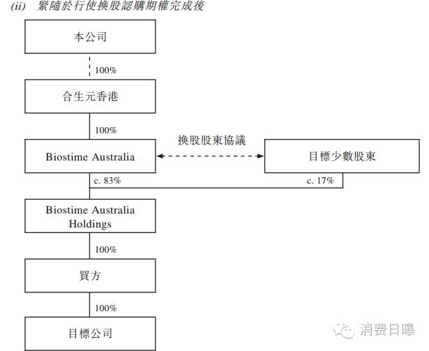 买方建议向目标少数股东发出期权通知以行使换股认购期权契据项下的换股认购期权,即有权利(惟须待若干条件达成后,方可作实)于收购事项完成后要求目标少数股东向买方出售彼等继续持有目标公司的全部股份,以换取发行同等股权的Biostime Australia Holdings股份。