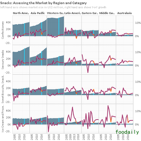 其他年份,北美及西欧市场已出现下降。然而,今年情况有所不同。拉丁美洲成为了最大的失误,2015年仅仅增长0.3%,很大一部分是由于三大零食市场:巴西、阿根廷和委内瑞拉的经济和政治颇为不景气。这么多年作为增长基石的中国,在2015年也面临着市场的大幅衰减,在2016年仅有轻微反弹。中国市场的变化恰似亿滋、好时以及其他零食巨头当年所经历过的。