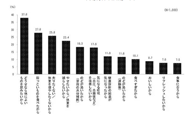 从左到右的理由分别是:想饮用对身体好的东西,在吃脂肪多的食物的时候,不想变胖/不想体重增加,想变瘦/想减轻体重,口渴时候(日常水分补给),想改善血液血糖值,介意健康诊断的结果,运动后的口渴,吃过量了,因为美味,想尝新鲜,正好碰上吃饭