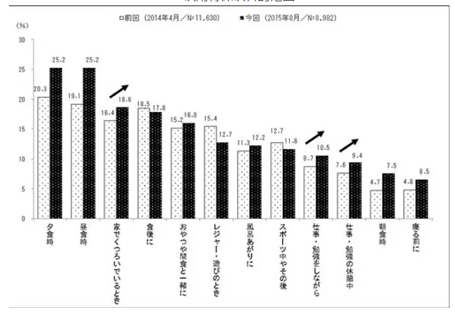 从左到右依次是:晚餐时,午餐时,在家里,饭后,喝下午茶时,娱乐/玩耍时候,沐浴时,运动中和运动后,工作学习时,工作学习中休息时,早饭时,睡前,从图表中可以看出,在中饭、晚饭和跟家人一起吃饭以及工作中,喝特保饮料的比较多。