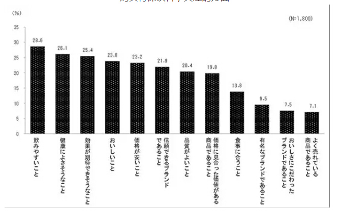 “对健康好”,“期待有效果”和“美味”,“易于饮用”重视这两部分的比例是相同的;“效果感”和“美味”两个方面是购买的重点。