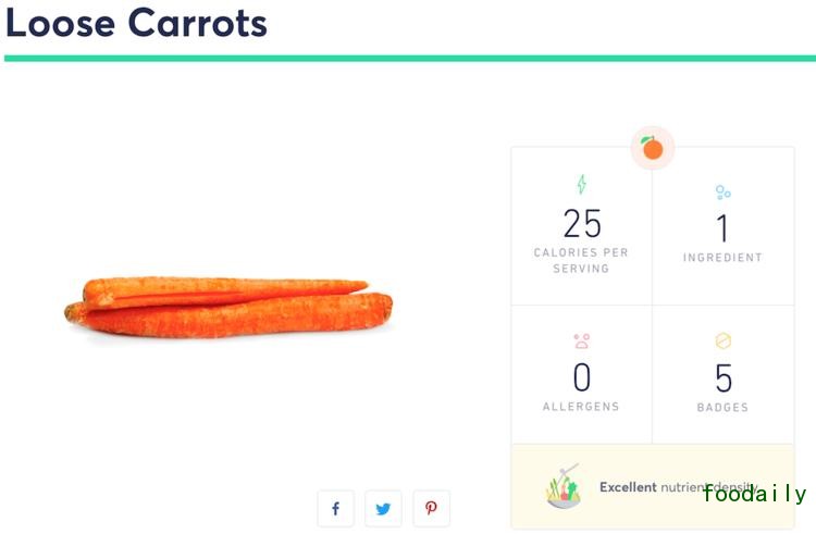 Sage Project 是美国一家线上食物查询网站,每一件食物都会列出详细的营养成分表。比如被视为健康食物的胡萝卜(非有机),旁边就标注着每份包含 25 卡路里和它所含有的营养成分,往下滑动后可知这 25 卡路里只占每天所需 2000 卡路里的 1%,它所含的维他命等营养元素也以人体需要的百分比显示。