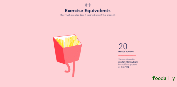 再向下拉动,就会看到一个奔跑着的薯条、跳绳的巧克力等,旁边显示着所需时间,它暗示骑自行车、跳舞、瑜伽、跑步、跳绳、游泳这几种方式消耗能量的方式,结合运动的生活才是更健康的。