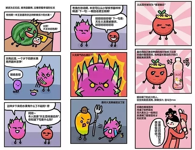 既然说是放大招,可不是只有些表情就算了。康师傅果汁这次联合小崽子,除了表情还有专为康师傅香凝荔枝画的定制漫画,通过好玩开脑洞的漫画,描述喝了康师傅香凝荔枝后颜值爆棚,同样向受众传达了“天生荔枝难自弃”。