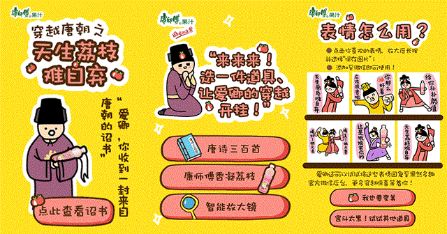 首款H5互动游戏以“唐诗三百首”、“康师傅香凝荔枝”、“智能放大镜”三种物品为穿越道具,带你穿越回唐朝体验三段不一样的唐朝人生。三段不一样的故事都能让受众充分感受到颜值加持带来的好处。以及康师傅香凝荔枝能为你的颜值加分。