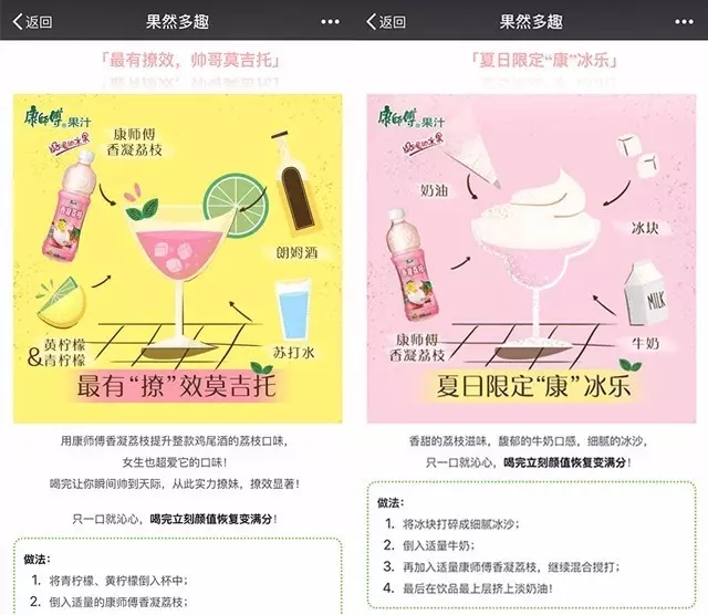 首先,是在果然多趣官方微信平台发布内容,教大家如何爆发脑洞,把康师傅香凝荔枝创意混搭为各种不一样的饮料,比如“夏日限定康冰乐”和“最有撩效莫吉托”,燃爆味蕾新享受。不仅喝起来美美的,看起来也是美美的,而且说不定还能带来奇效。