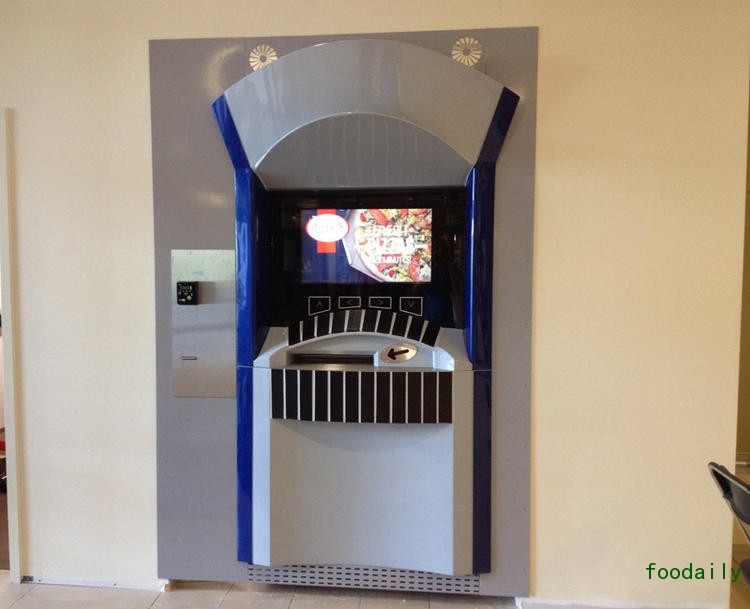 购买者所需要做的,只是在触摸屏上选好馅料,包括辣香肠、奶酪、蔬菜等等,然后按下确认按钮。饼坯会从冷冻室被移动到烤箱,并在 3 分钟之内烤熟,再被送到一个特殊的披萨分配槽中,方便购买者取走。