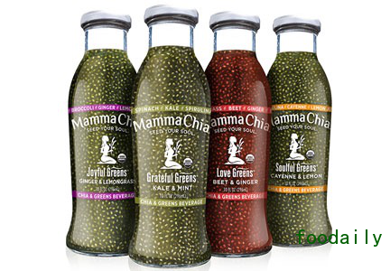 在6月底的北美夏季特色食品展上,Mamma Chia展示了一系列含芡欧鼠尾草的绿色果汁饮料,还包括一些蔬菜汁饮料,如羽衣甘蓝、菠菜、花椰菜、螺旋藻、大麦草和小麦草等。风味上则有辣椒、柠檬、甜菜和生姜、羽衣甘蓝和薄荷以及生姜和柠檬草味。