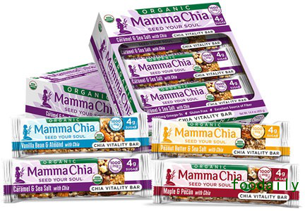 Mamma Chia 同时还推出了一系列低含糖量零食棒。以坚果、原始谷物和芡欧鼠尾草为特征的有机零食棒含有150 卡路里和4g糖。种类包括花生黄油海盐、香草海盐焦糖和枫叶胡桃。