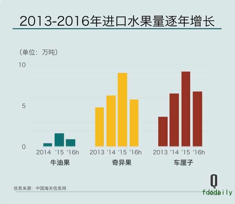 一个明显的现象是,近几年来进口水果的类型变多了,价格也便宜了。我们选取了牛油果、车厘子和奇异果近几年的进口量,看看它们这几年在中国有多火(注意,2016 年仅仅有半年的统计量,照这个增长速度,预期最终结果也会非常可观)。