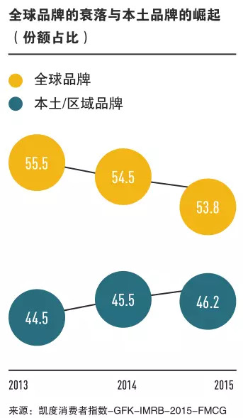 凯度消费者指数总监Alison Martin所说的“消费者需求碎片化,小企业能更迅速地调整适应消费者喜好变化,而跨国企业原有的规模优势遭到了侵蚀。”Martin谈到:“在发展中市场,呈现碎片化的主要不是产品,而是区域市场。比如,中国的增长速度比很多市场都快,但它的增长主要来源大城市以外的地区。国际大品牌在经营结构上更适合在大城市进行规模发展,而不太容易深入到偏远城市中,而本土品牌则蓬勃发展。”