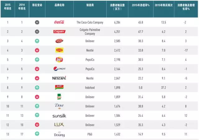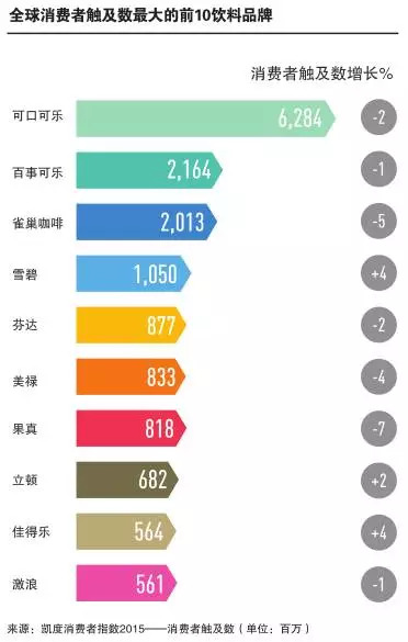 可口可乐依然是市场领导品牌,触及全球46%的人口。2015年是红牛的丰收年(排名第96位,消费者触及数增长8%)。雪碧是10强中增长最快的品牌。
