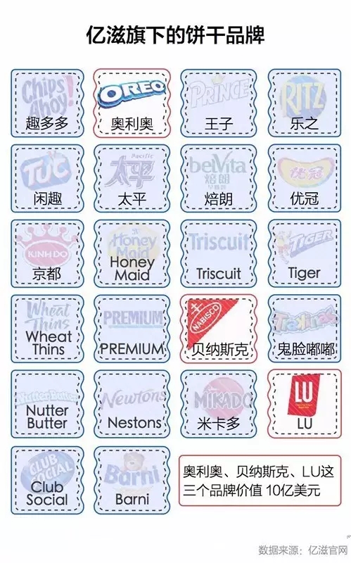 亿滋国际的前身为卡夫食品公司。作为全球知名巧克力和饼干制造商,亿滋国际旗下拥有奥利奥、趣多多、怡口莲等众多品牌,部分饼干品牌是通过合并达能的饼干业务获得的,其中不乏价值10亿美元的饼干品牌。