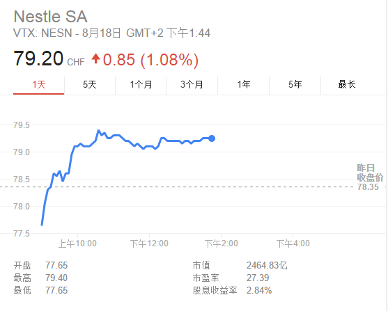 雀巢股价当前涨1%,至每股79.2瑞郎。