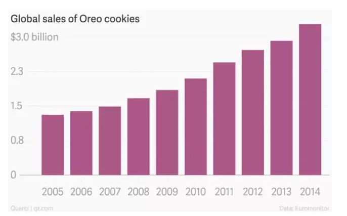 1912 年诞生的奥利奥饼干一直是全球最流行的零食之一,2014 年奥利奥饼干的销量是 25 亿美元,而且最近十年它的销量一直处于增长之中。