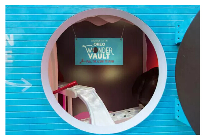 除了换饼干口味以外,今年奥利奥还在纽约开了一个快闪传送门 Wonder Vault,蓝色的门上面有块奥利奥饼干形状的门,打开之后你就能看到在传送带上的奥利奥饼干。这里面不只是奥利奥在市面上出售的口味,还包括了 50 种味道的原型还有 100 多种正在构思之中的口味。