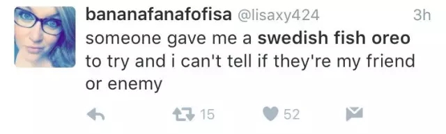 网友评论:有人给了我一块瑞典鱼奥利奥饼干,我不知道这人到底是我的朋友还是敌人
