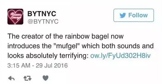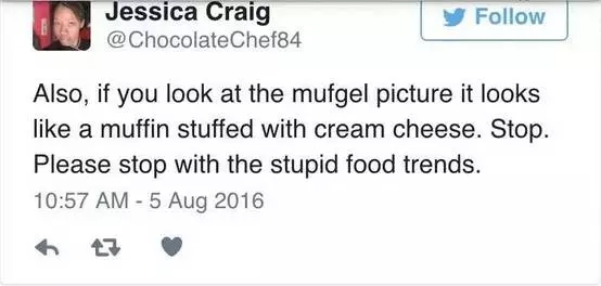 这款甜点名叫mufgel ,由马芬和百吉饼混搭而成。对此,外媒一边倒地称这是食物界的一股新趋势,掀起了一阵狂热。不过亦有吃瓜群众见状表示: