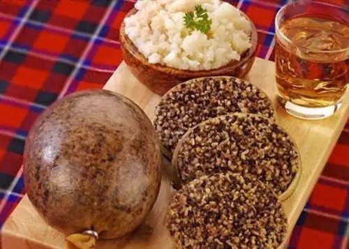 哈吉斯,又名黑布丁,羊胃中间裹着用猪血混合的燕麦粉或玉米粉,再混入洋葱、牛脂、香料等用水煮熟,淋上酱汁就着土豆泥一同食用,据说口感和土豆煎饼差不多。看着有点瘆人,不过它也被誉为“苏格兰国菜”,英格兰和威尔士也在争这道菜的“所有权”。