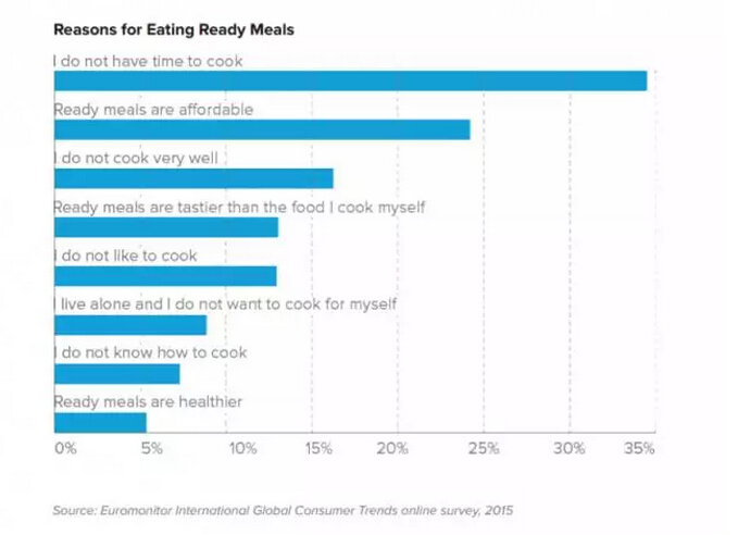 (选择即食食品的理由分布图,其中最主要的理由是“没有做饭的时间”和“即食食品的价格可以接受”)