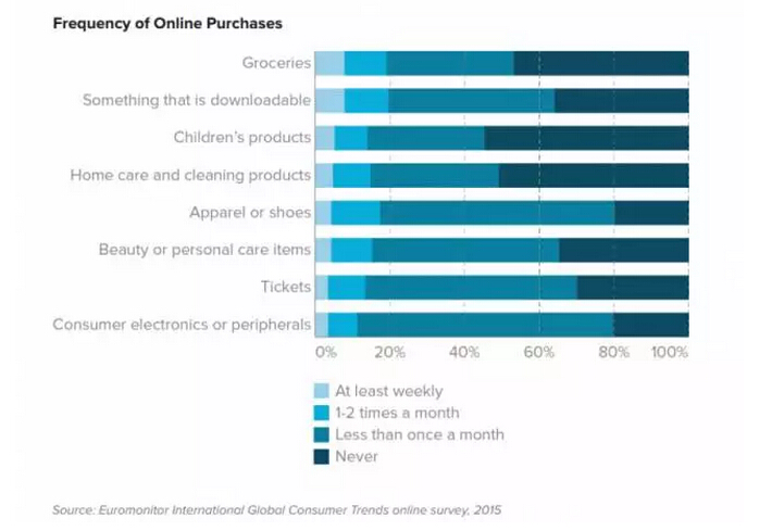 (消费者在网上购买各类商品的频率分布,杂货的购买频率最高)