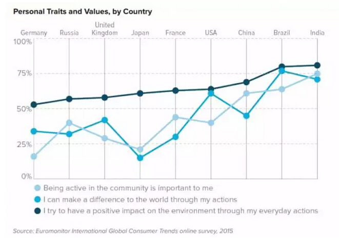 从上图便可以看出,世界各大主要市场的消费者,大部分均希望能够通过自己的行为,对社会产生积极的影响。