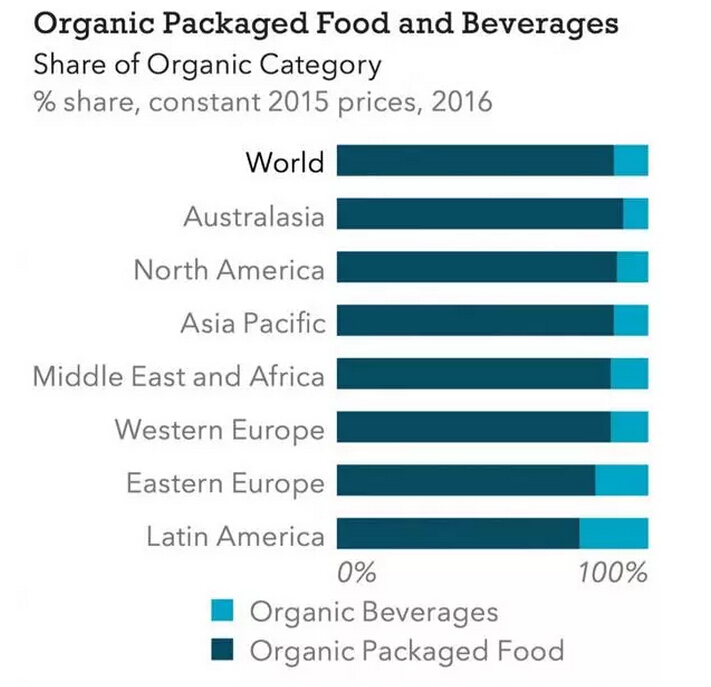 全球及各地区有机包装食品和饮料占有机食品领域的份额