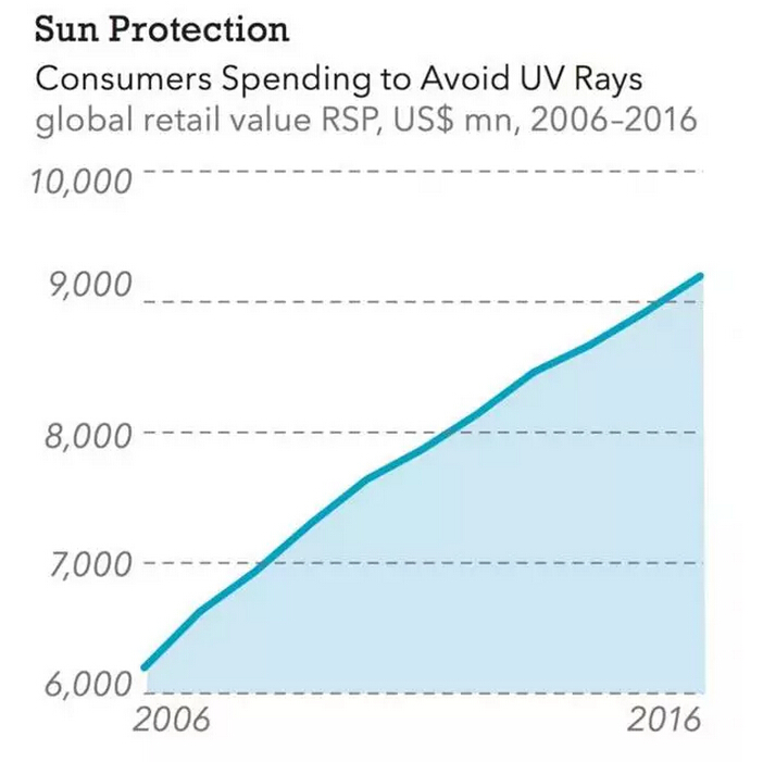 2006~20016年,随着消费者防紫外线意识增强,全球防晒用品零售值逐年递增