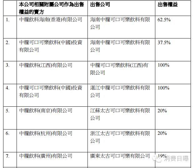 待售的这10家装瓶厂分别为:海南中糧可口可樂飲料有限公司62.5%股权,海南中糧可口可樂飲料有限公司37.5%股权,中糧可口可樂飲料(江西)有限公司100%股权,湛江中糧可口可樂飲料有限公司100%股权,江蘇太古可口可樂飲料有限公司20%股权,廣東太古可口可樂有限公司19%股权,廣東太古可口可樂惠州有限公司7.6%股权,溫州太古可口可樂飲料有限公司7.15%,上海申美飲料食品有限公司可口可樂裝瓶部 (「上海申美」)14%股权。