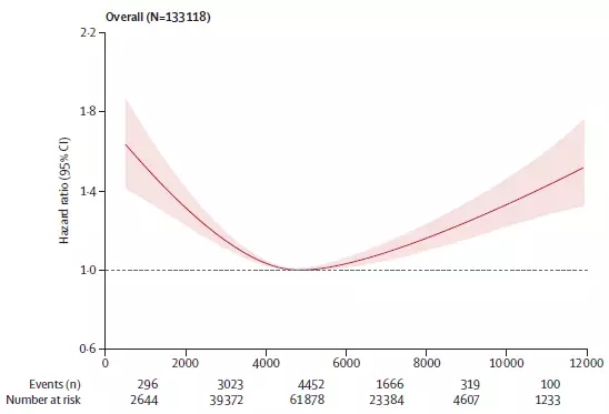 从总体样本来看,当尿钠达到约5000mg/d时,风险比最低,过高和过低都会提高心血管病事件的风险