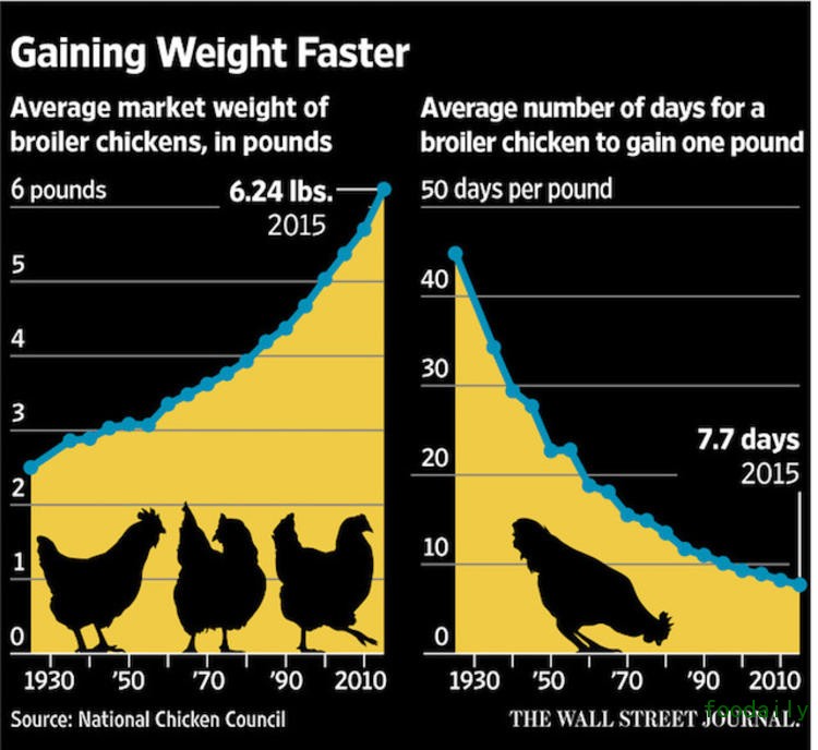 在过去五十年中,人类养的鸡越来越重,养殖过程越来越短。在美国,2015 年每只鸡的平均重量是 6.2 磅(2.81 公斤),平均养殖天数是 48 天,而 1965 年这两个数据分别是 3.5 磅(1.59 公斤)和 63 天。