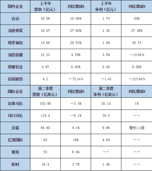 2、从以上表格统计整体数据来看,除了百润股份、百事可乐、可口可乐营收同比去年有所下滑之外,其他企业业绩整体呈向上发展之势。