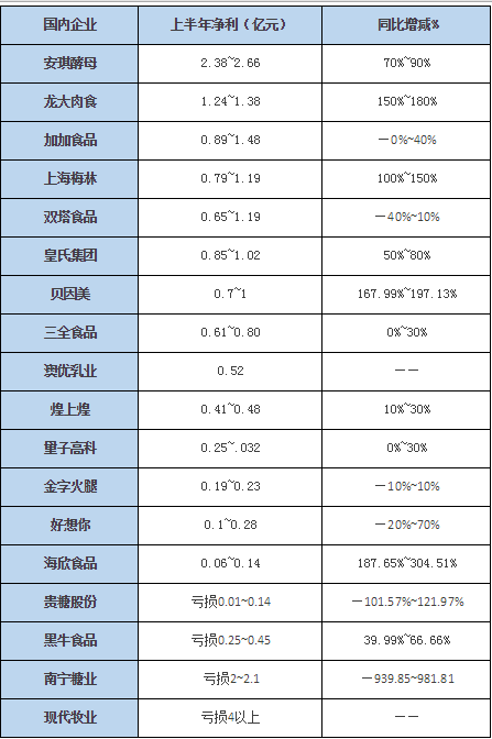 由上表企业可以看出,几乎过半企业预计净利润将实现增长,龙大肉食、上海梅林、贝因美、海欣食品净利润增长甚至超过了100%;而加加、皇氏集团、双塔食品、上海梅林等企业的上半年净利润均将可能超过1亿元。
