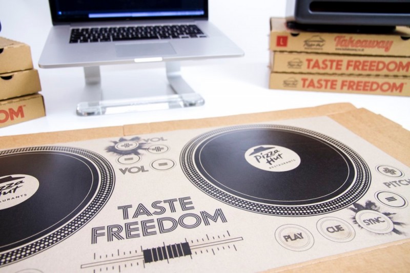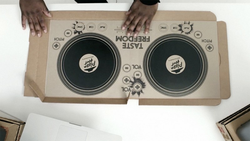 所以最近必胜客又在英国推出了5个特别的披萨盒子,展开这个包装盒就能看到印上去的DJ碟机,但它并不只是长得像可操作的DJ碟机,当中还集合了电路板和蓝牙装置,只要你装上电池,这款包装盒就会变成真正的DJ操控台,让你来好好打一次碟。