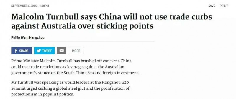 另据新华社昨日报道,国家主席习近平当天杭州会见在华出席二十国集团领导人杭州峰会的澳大利亚总理特恩布尔。习近平指出,中方高度重视发展中澳关系。他又指出,双方要积极拓展能源资源、农牧业、食品加工、基础设施建设等领域合作,更好实现互利双赢。