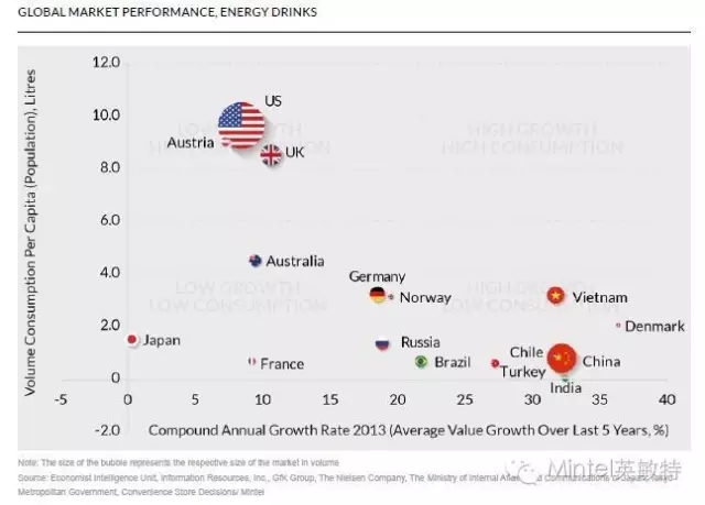 正如2016年奥运会产生新记录一样,英敏特调查显示中国能量饮料消费达到了一个新的水平。从2014年到2015年,,中国能量饮料的消费增速最快,消费量增长了5亿4500万公升,年增长率则达到惊人的25%,几乎是美国消费年增长率的四倍。