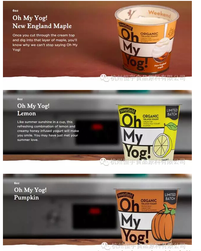 Oh My Yog!在获得成功的同时也不忘积极创新,不断结合消费者需求和市场风味趋势研发新品。在近期先后发售新英格兰枫糖、柠檬夏季限量版和南瓜秋季限量版产品。新颖的风味激发消费者冒险的欲望,层层深入,带给你三种不同的味觉体验,最后细腻的奶油、香醇的酸奶和美味的酱料在舌尖交汇,无比美妙!