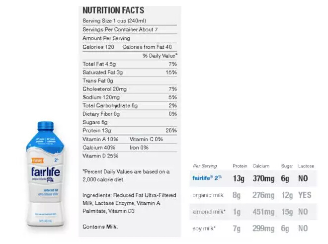 Fairlife产品的主要卖点是富含营养又有可持续性。Fairlife牛奶的制作工艺很独特,原奶先是被分解成了水,维生素和矿物质,乳糖,蛋白质和脂肪,之后再巧妙地按比率混合。因此,相对于一般的牛奶来说,Fairlife似乎更加营养与健康,比如说其中的Fairlife2%低脂牛奶:可从下图中看出,相比于传统的牛奶,Fairlife2%多了将近一倍的蛋白质,少了一半的糖,并且不含乳糖。