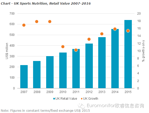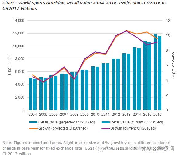 2010年至2015年全球运动营养品市场增长迅速,五年内零售额增长了56%,2015年零售额达到了106亿美元。从地域来看,这个惊人增长主要来自于运动营养品最大的市场美国,其销售额约占全球市场的64%。 其他较大市场,澳大利亚、英国、巴西和加拿大总计占比为17%. 另外,消费者对运动健身的浓厚兴趣也推动了运动营养品市场的增长。