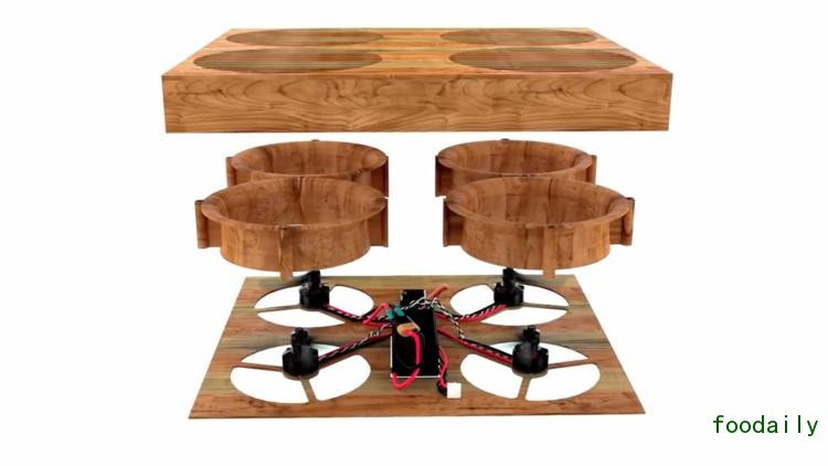最近,美国一家公司就发明了一款可以满足这种需(懒)求(惰)的飞行托盘。这款被称为 Jerkybot 的“世界上第一只零食飞盘”,原理实际上类似于一只无人机,只不过是由四轴螺旋桨内芯和木质的案板外壳组成。零食可以被放置在案板上,使用时对内部的编程系统进行设置,它就可以跟随着主人飞行了。还能够保持在特定的——大约是手臂伸出的——距离和高度,确保使用者能以最轻松的姿势拿到案板上的零食。