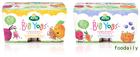 Arla乳品公司针对儿童开发了新的酸奶系列Big Yogs,每一盒都组合了不同的水果蔬菜。