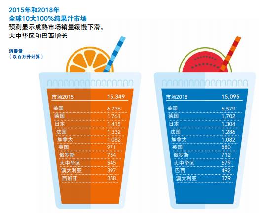 除大中华区之外,全球排名前十的所有市场在过去三年中均呈现下降趋势;与此相对,尽管销量基数较小,但大中华区果汁市场在2012-2015年的年复合增长率高达11%。目前大中华区已成为世界第八大果汁市场,2015年消费量达5.45亿升,但仅相当于排名第一的美国市场消费量的8%,而过去三年里美国市场果汁消费量下降了2.6%。展望未来,预计大中华区果汁市场到2018年之前的年复合增长率都会保持在7.7%的水平。