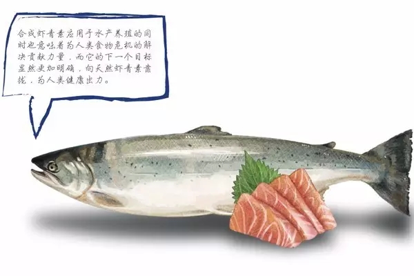 当然人类将合成虾青素添加到饲料中,饲养类似于三文鱼这样的鱼类并不仅仅是为了追求其更美丽的色泽。作为一种强抗氧化剂,合成虾青素还能显著提高三文鱼的免疫能力和健康状态,并且作为天然激素促进鱼卵受精,减少胚胎的死亡率,促进个体生长,增加成熟速度和生殖力。甚为重要的一点是,合成虾青素更够显著提高三文鱼等水产品的营养价值,从而有利于人类健康。
