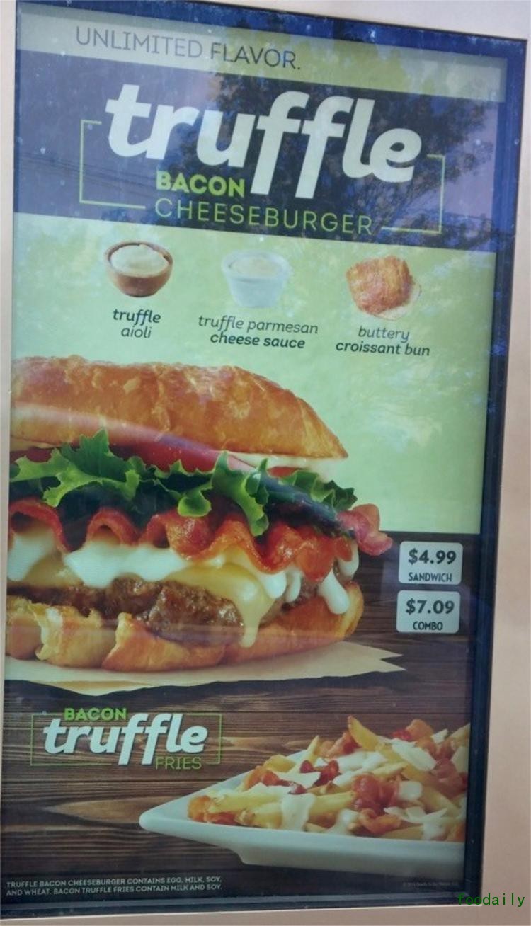 这么做的并不只有麦当劳。美国的另一家快餐品牌近日也在小范围内推出了含有松露元素的汉堡 Truffle Bacon Cheeseburger 和薯条 Bacon Truffle Fries,前者的食材原料中包括松露酱、松露芝士酱,以及奶油可颂面包等。汉堡的售价为 4.99 美元,套餐价则为 7.09 美元——与 Wendy’s 此前的产品价格相差无几,甚至还比 Wendy’s 的双层牛肉芝士汉堡价格更低。
