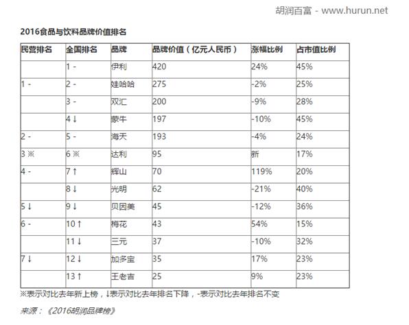 近日,胡润研究院发布了《2016胡润品牌榜》,共200个最具价值中国品牌上榜。伊利在食品饮料行业所有上榜品牌中以420亿元(人民币)的品牌价值排名第一,品牌价值上升24%。就在几个月前,在2016年度BrandZ™中国最具价值品牌100强榜单中,伊利集团以62.35亿美元的品牌价值,蝉联食品类排行榜第一,品牌价值和去年同期相比提升了22%。