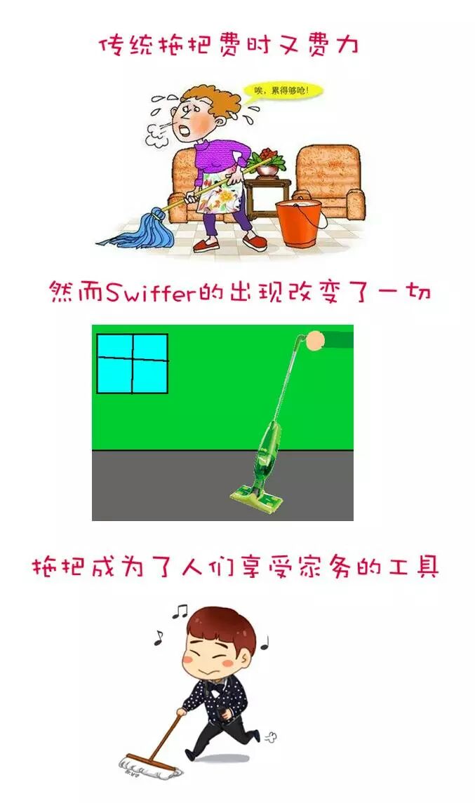 Swiffer的故事已经在行业里被讲述了很多次,其成功的核心掌握在那些显而易见,却经常被忽视的问题。在Swiffer出现之前,拖把对消费者来说只是一个勉为其难的选择——用拖把清洁地板是一种刚需,但是很多情况下,即便消费者倾尽全力,仍然不能很好地完成清洁地板的任务。消费者不喜欢它们把地板弄得很潮湿,他们想要的只是把污水移到其它地方,但事实上避免污水溅到身上是一件十分困难的事情,这要求消费者随时拖着一个水桶,并且一个浸满水的拖把总是有太多的阻力,总之,整个使用体验是十分糟糕的。