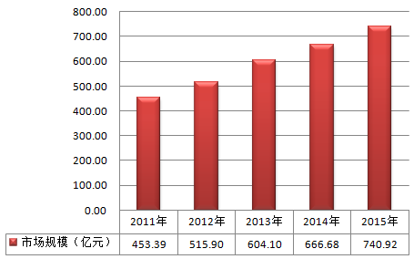 (2011-2015年我国烘焙食品烘焙饼店渠道市场规模变化图)